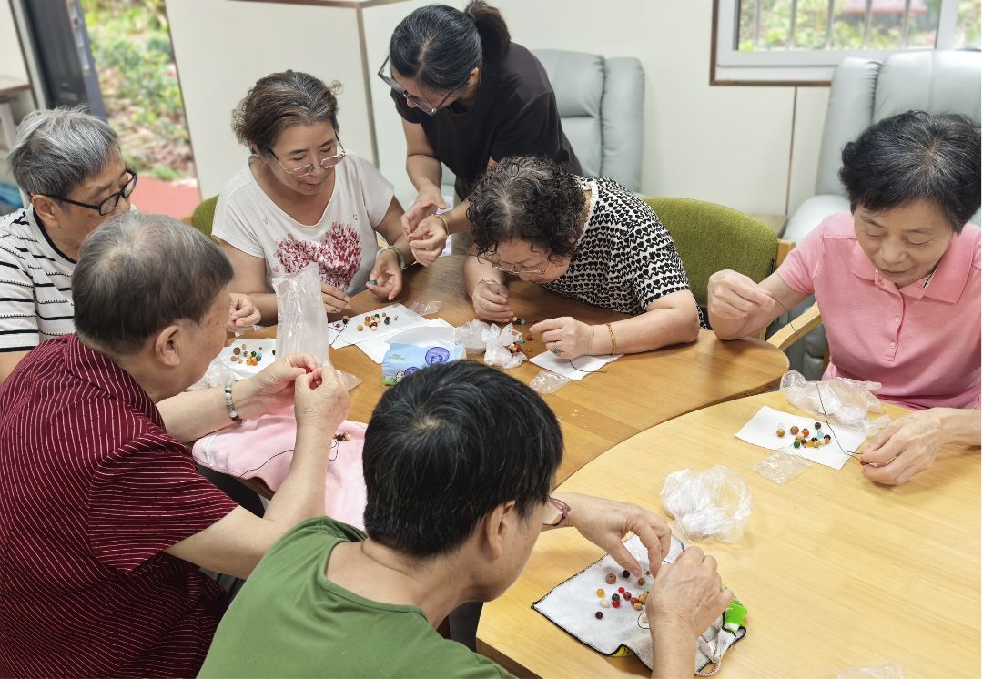 此外,服务站还根据老人们的喜好,将节日元素与创意融入各类实用精美的手工艺品制作中,为他们送上一份特别的温暖与关爱。长二一委为老服务站开展了马赛克杯垫制作,长四一委为老服务站开展了手串制作,长三为老服务站则举办了国庆节主题非遗拓印团扇手作活动。老人们在制作过程中不仅享受了手工的乐趣,更表达了对生活的热爱和对祖国的祝福。