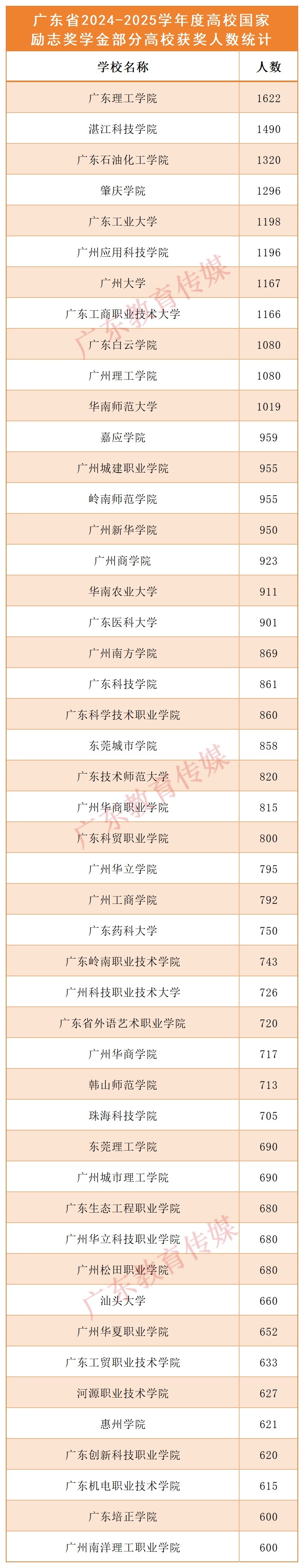 据统计,11所高校有至少1000名同学上榜。其中广东理工学院共有1622人上榜,为全省高校中获奖学金人数最多的高校;湛江科技学院和广东石油化工学院紧随其后,分别有1490人、1320人获奖。