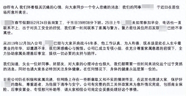 我们怀着极其沉痛的心情,向大家同步一个令人悲痛的消息:我们的同事**意外离世。**在春节假期后于2月24日返岗复工,当日19时08分下班。25日上午**未如常参加早会,电话也一直联系不上,出于对员工安全的担忧,我们第一时间联系了家属与警方。警方前往其住所后发现:已经不幸离世。